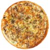 Пицца-соус, сыр Моцарелла, куриное филе, водоросли нори, кунжут, соус “Терияки”, лук репчатый, зелень.