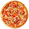Пицца-соус, сыр “Моцарелла”, куриное филе, перец болгарский красный и зеленый, помидоры, острые перчики халапенью, лук.